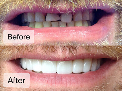 After completing an esthetic waxup, to show the patient what his new smile will look like, Dr. Reilly restored all of his upper teeth with Zirconia crowns to close the spaces in his smile and restore his teeth to their proper form, function, esthetics.